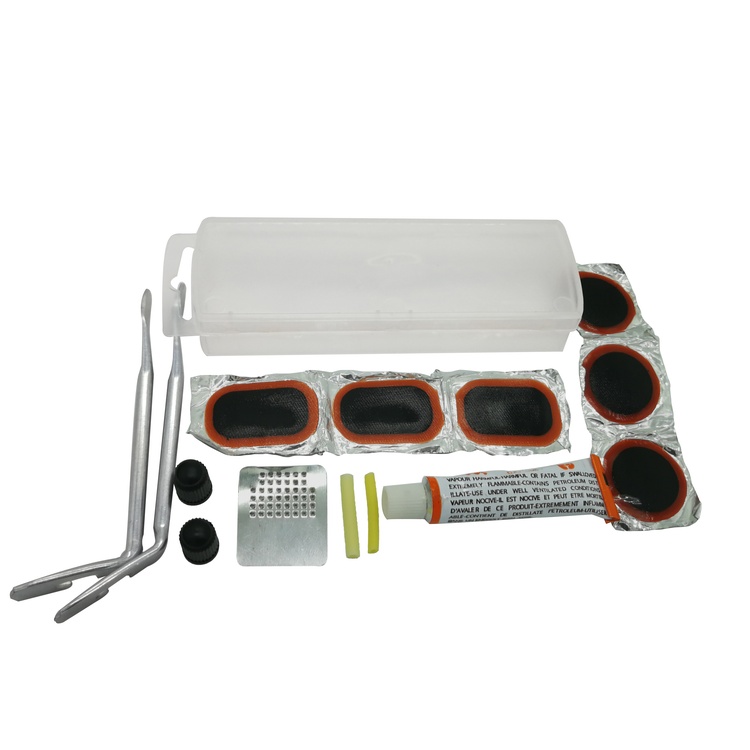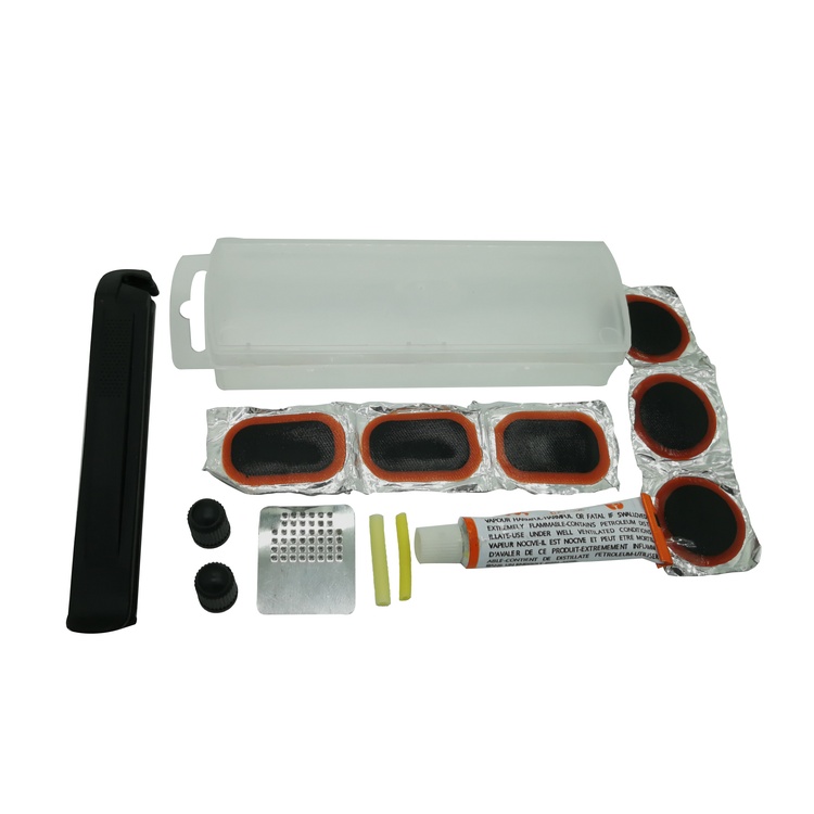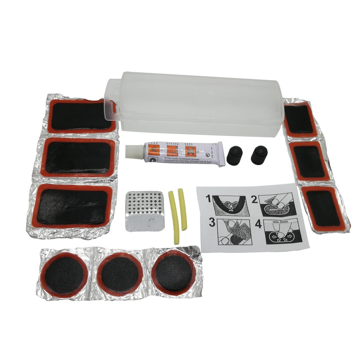 3* Round Cold Patch 3* Medium Oval Cold patch 3* Big Oval Cold Patch 1* Metal Rasp 1* Rubber Glue 2* Valve | 2* Valve caps 1*User Manual 1*Plastic Box Weight:33G Box Size:130*38*20 mm |
