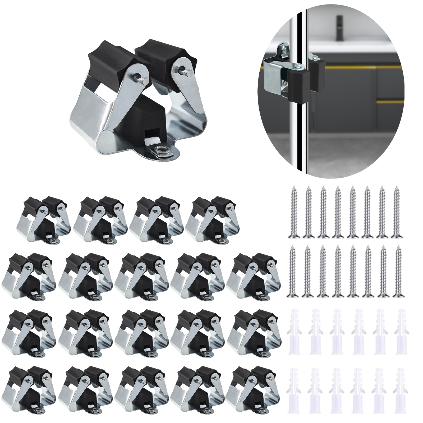 Package Including: Set includes two screws and two plastic dowels per broom clip