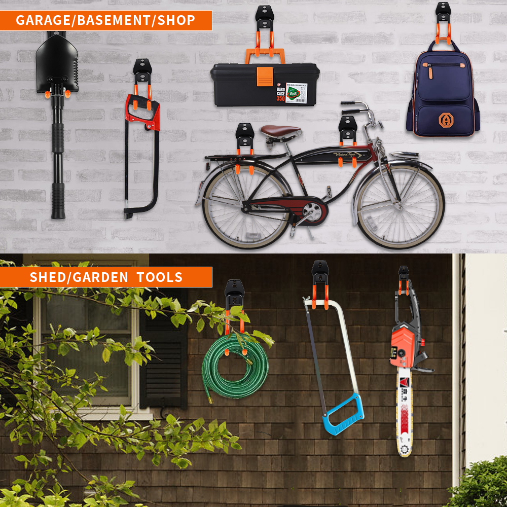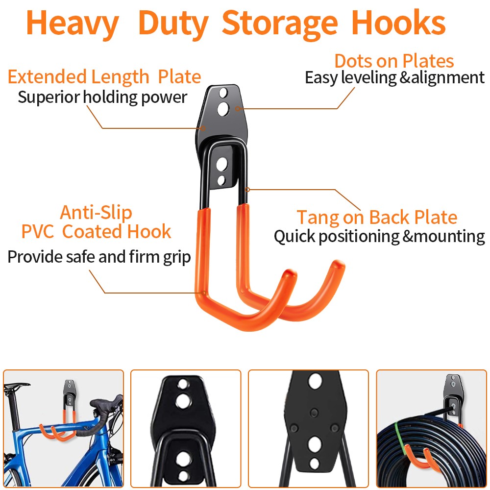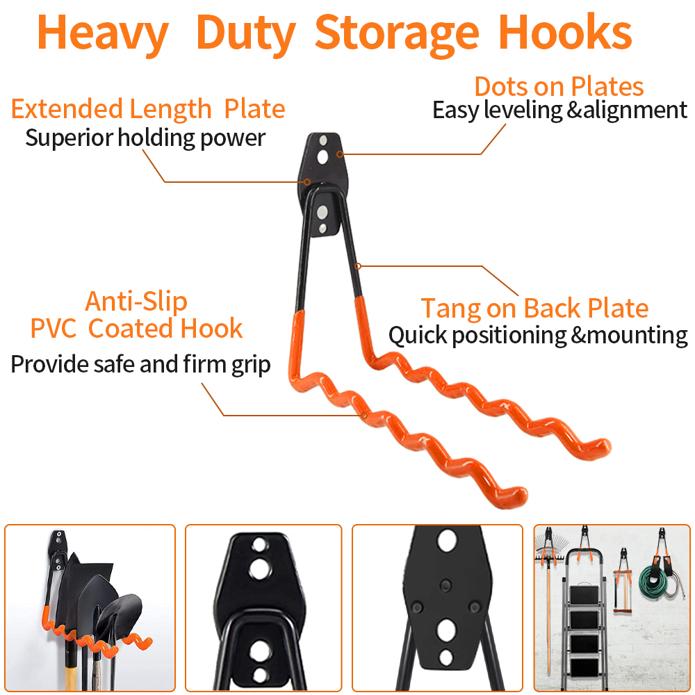 • ★-PREMIUM QUALITY: The garage hooks are made of thick steel with anti-slip PVC dipping coated preventing the scratching , Sturdy design provides superior load-bearing capacity, which allows garage wall hooks to hold various tools firmly, including power tools, garden tools, shovel, weed eater, broom, ladder, bicycle, ropes, hoses, etc. ladder hooks for garage wall are durable to endure a life-long time using experience.