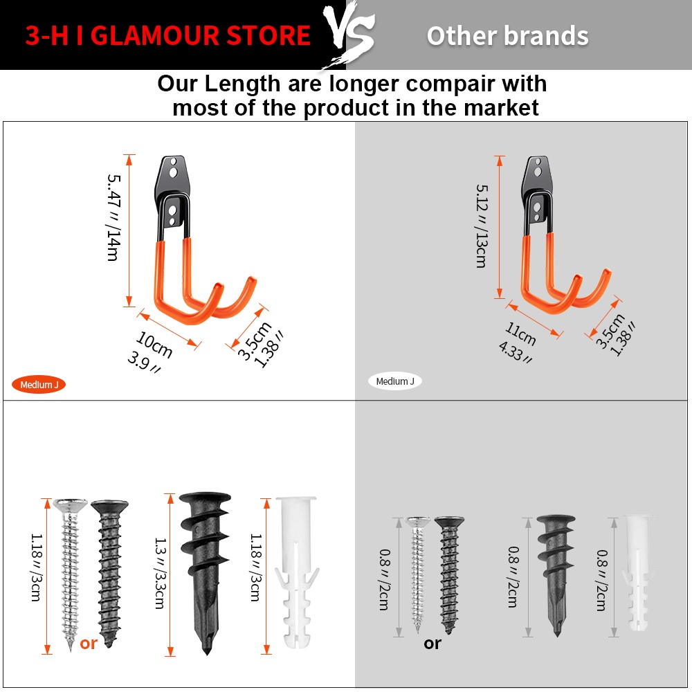 • ★-- EASY TO INSTALL: These garage hooks for hanging are suitable for plaster, wood, brick, and concrete walls. You can install ladder hanger effortlessly. For plaster walls, (1)Mark two big holes; (2)Twist the black wide thread screw plug in. For wooden/brick walls, (1)Mark two small holes; (2) Drill a hole and hammer in the plastic anchors; (3) Twist the steel screw nail into the anchor. Bearing capacity depends on different types of walls; different sizes of tool hooks and screws.