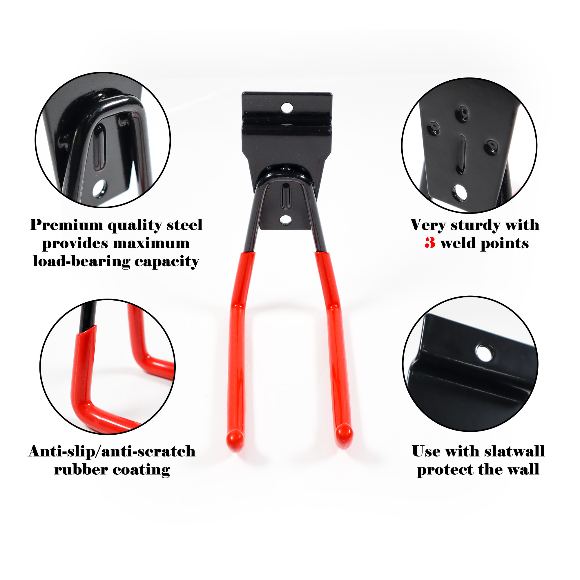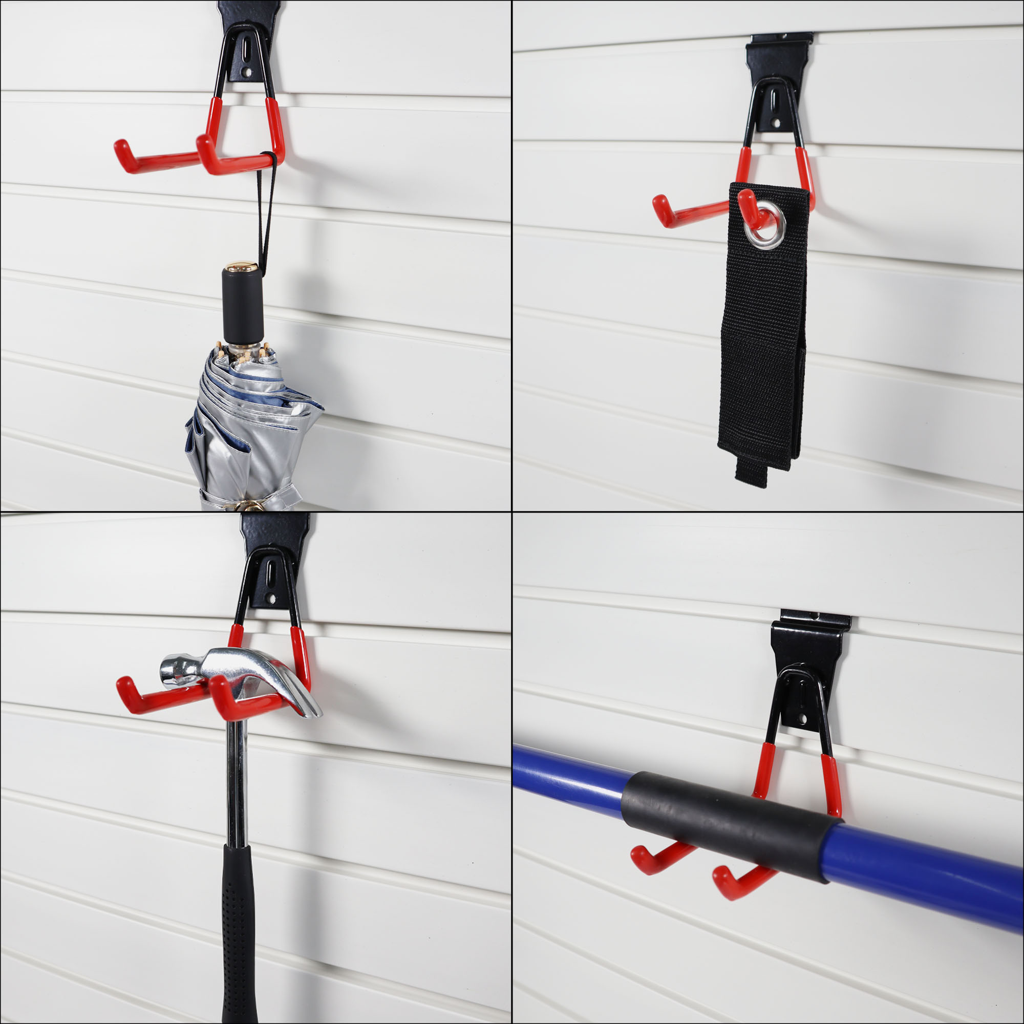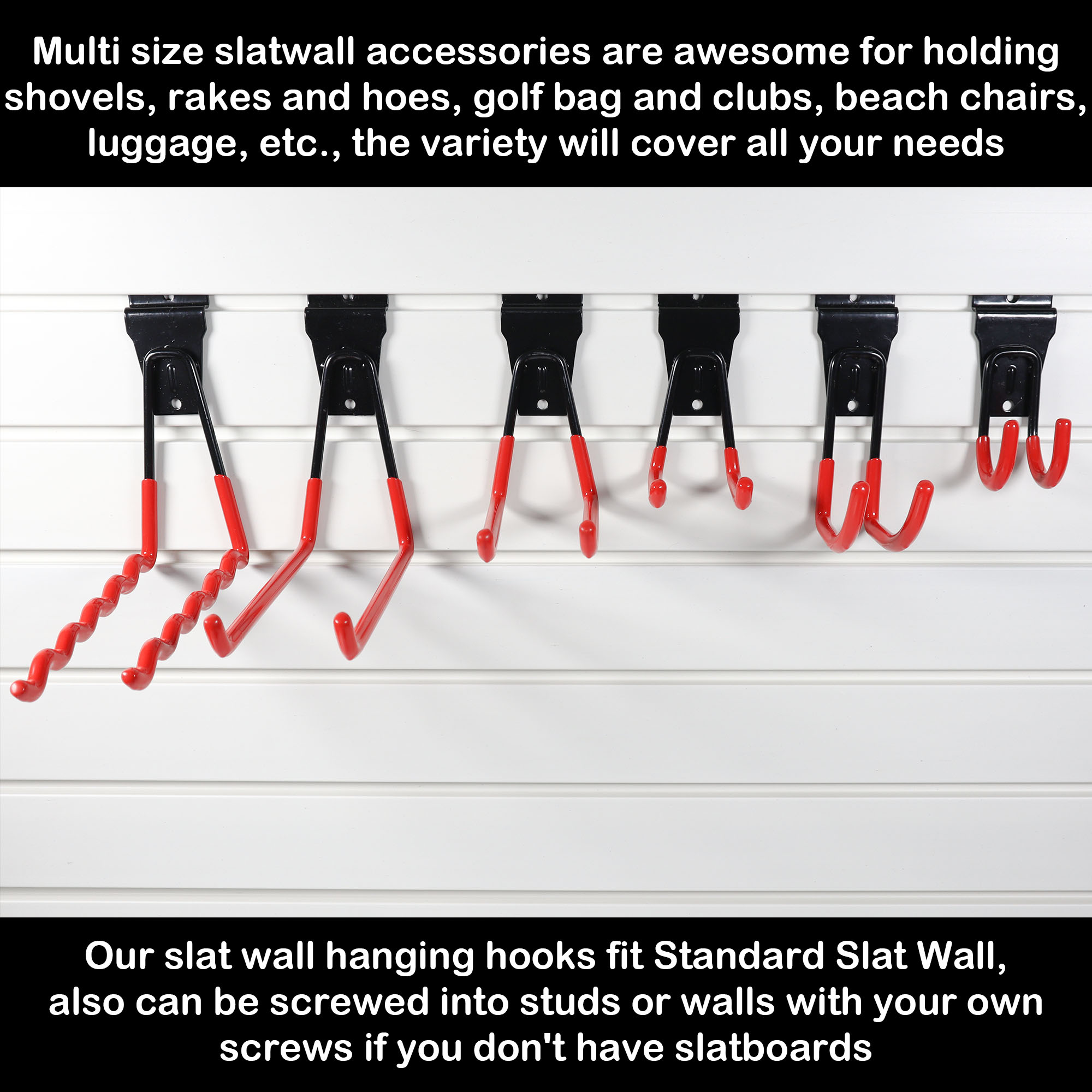 Multi size slatwall accessories are awesome for holding shovels, rakes and hoes, golf bag and clubs, beach chairs, luggage, etc., the variety will cover all your needs