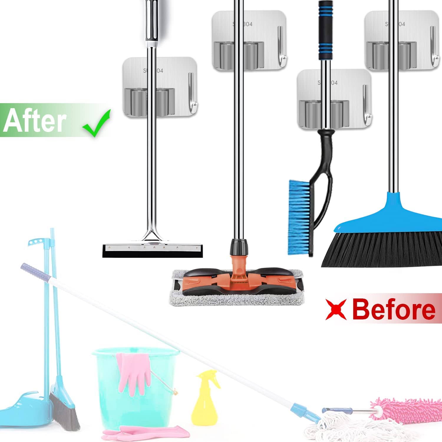 【Space Saving】: Say goodbye to messy closets and cleaning supplies scattered on bathroom or garage shelves with this broom holder wall mount. It's a great way to organize your brooms, mops, rakes, garden tools, and more! A tool organizer with a compact size and clean design is the perfect choice for you. Keep everything looking tidy and cozy with this broom holder wall mount. 【2 Installation Methods】Our broom holder wall mount provides two installation methods: Screw drilling and Self-adhesive, you can choose the appropriate installation method according to the wall surface of your home. Self-adhesive is suitable for smooth walls, screw drilling is suitable for rough or outdoor walls, such as walls in garages, basements, and storage rooms. 【Non-slip Fixed Design】:This tool organizer with a rolling rubber ball ensures that brooms and mops will not fall out, including wet mops, dirty rakes, vacuum cleaners, and other hardware tools. 4 spring-loaded slots with rubberized grips fit snugly over tool handles, keeping them securely in place. broom holders can hold up to 40 lbs. You can use this tool storage to hold everything from brooms and mops to gardening and hardware tools. 【Multi-purpose Broom Holder】:The broom organizer wall mount is perfect for the kitchen, bathroom, closet, garage, and laundry room. It can hang brooms, mops, vacuum cleaners, rags, gloves, etc. This tool organizer has a waterproof design, it can go anywhere you need to install, and can even be used outdoors or in a storage room to place your gardening tools and hardware tools. 【High-quality and Durable Material】: The broom holder wall mount is made of high-quality SUS 304 stainless steel, a high-quality material that is ultra-light and extremely durable. Never rust and has an extremely long service life. The triangular buckle and petal-shaped gear automatically adjust the size according to the different thicknesses of the handle to prevent objects from slipping. Holds up to 10kg and is stronger than plastic stands. |