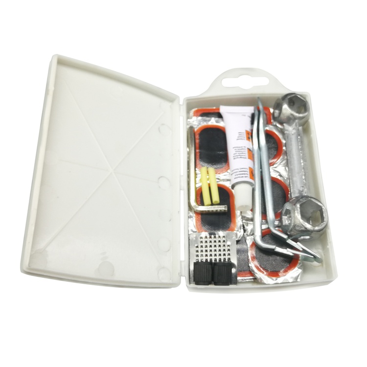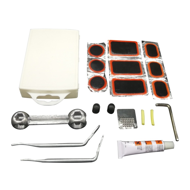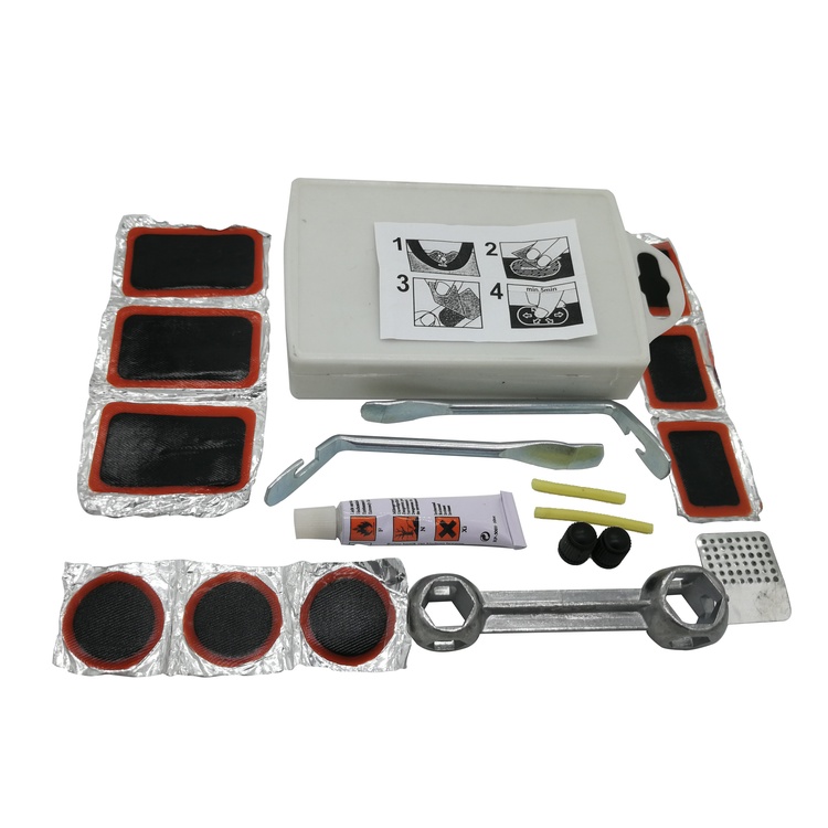 2* Stainless Steel tire lever 3* Round Cold Patch 3* Medium Oval Cold patch 3* Big Oval Cold Patch 1* Metal Rasp 1* Rubber Glue 2* Valve | 2* Valve caps 1*6-15mm socket wrench 1*L 40 mm wrench 1*User Manual 1*Plastic Box Weight:100G Box Size:140*75*22 mm |